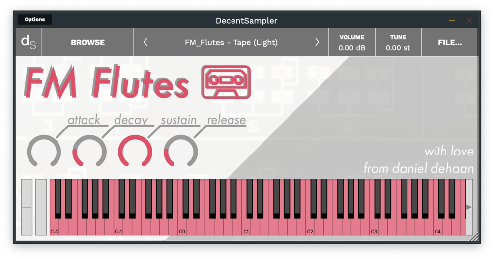 Created for the free Decent Sampler player, this instrument was sampled from a classic Yamaha DX7 and comes in two flavors: a brighter and completely unprocessed "clean" sound which was recorded directly from the original instrument, and a "tape" version which is warmed-up, saturated, and embedded with the wonderful wow and flutter of an old cassette tape.