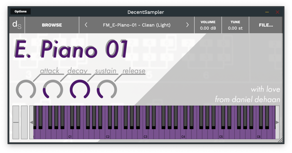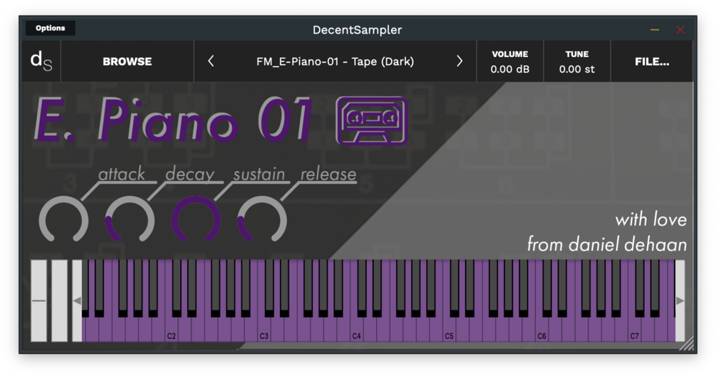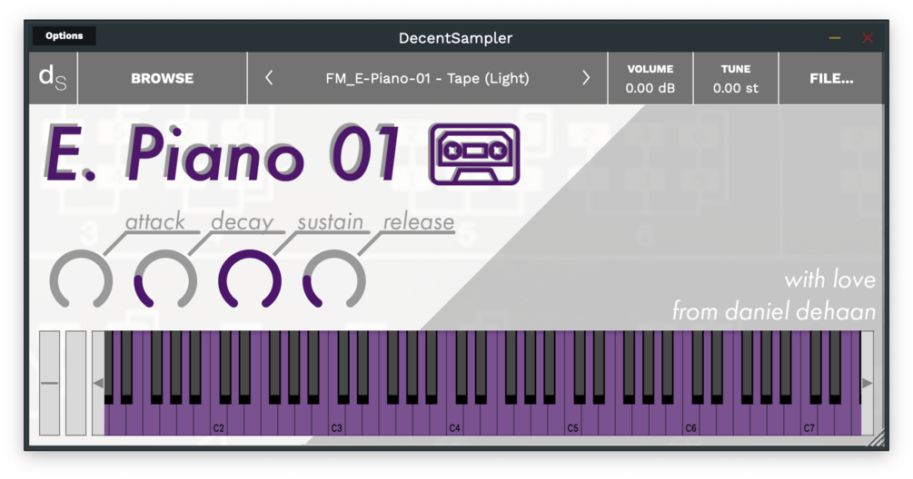 Created for the free Decent Sampler player, this instrument was sampled from a classic Yamaha DX7 and comes in two flavors: a brighter and completely unprocessed "clean" sound which was recorded directly from the original instrument, and a "tape" version which is warmed-up, saturated, and embedded with the wonderful wow and flutter of an old cassette tape.